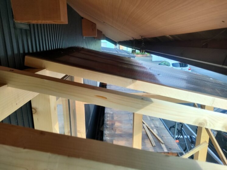 屋根垂木は3.6mを半分に切っただけではマンションの駐車場にギリギリ掛かってしまうので、桁から10㎝程度の出にしました。