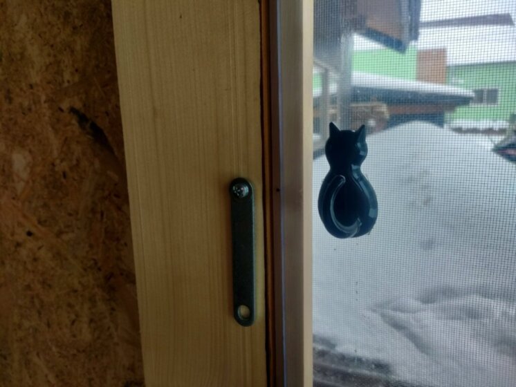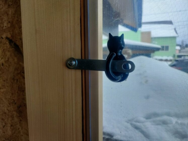 ・取っ手に“猫のしっぽフック”を採用し、柱に回転するバーを取り付け、それをフックに引っ掛けて閉じた状態or開けっぱなしを固定